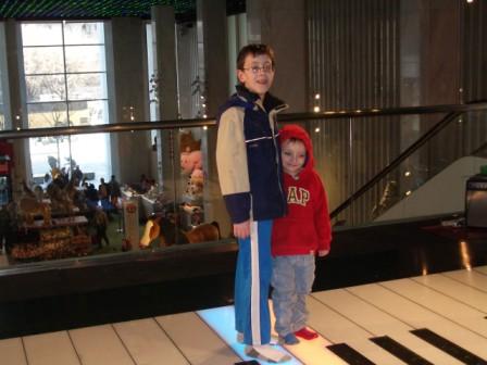 After lunch, we went to FAO Schwartz. Kieran just about died of pleasure when he saw the very expensive “Madame Alexander” collection of Wizard of Oz dolls!!! Excuse me, $250 for a doll? No way! Both older boys enjoyed dancing on the “Big” piano, although Kieran was wearing a pair of slightly too big jeans, and they kept falling down around his ankles, making me crack up.