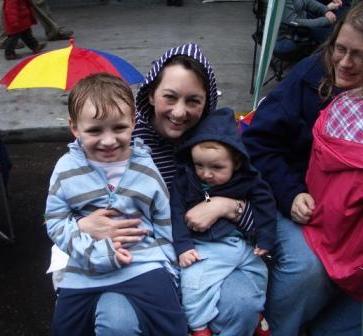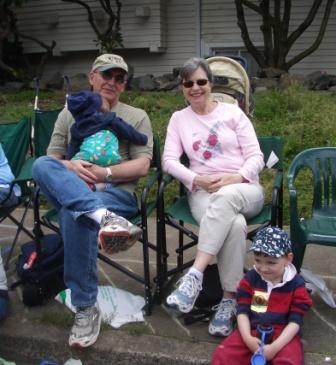 Then we decided to brave the inclement weather (it wasn’t raining when we left home) and went to the Grand Floral Parade on Saturday morning. Some NICU graduate family friends have a tradition of attending the parade and go to great lengths to tape the sidewalk the day before. Poor Charlene had to defend her tape against the tape- and chair-freeing renegade army this year. It’s always a great opportunity to catch up with them and marvel at how much all of our kids have grown.