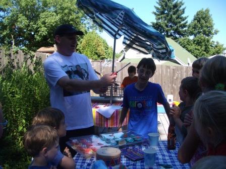 We had a cello solo, a piano solo, a knock-knock joke performance, two “dances,” an original song, and an original, impromptu skit. Three of the kids got stage fright–totally understandable–but they received awards for “best audience members.” Each of the kids got a trophy. Very fun!! I also had a craft project for them instead of a goody bag–I’d bought CD cases and pens for them to decorate them…and they all dove in, but it lasted a total of 2 minutes before they were done! So much for that idea to occupy their time!