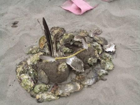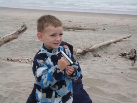 We spent a few days at the beach last weekend, and had a few perfect Oregon days on the coast…not too hot, not too windy, and not too much rain. Nicholas enjoyed crawling through the sand and napping on Grandpa, while Chris, Kieran, and Mike flew a kite, and Kieran built a beautiful sand castle adorned with tons of oyster shells we found in the shallow surf. Later in the day, Grandpa took the boys on their first fishing trip. Although both boys caught some fish, the trip was not entirely successful, I should add, because Kieran’s fish were tiny minnows and had to be thrown back.