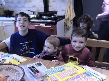The boys at the kitchen table with Meredith by the Aga in the background
