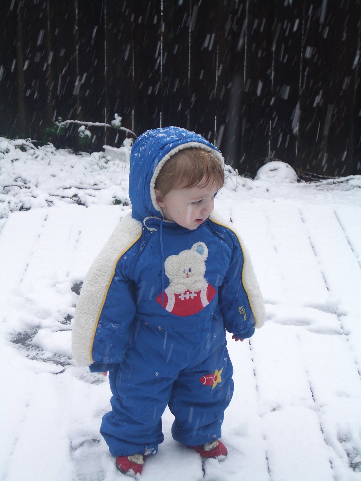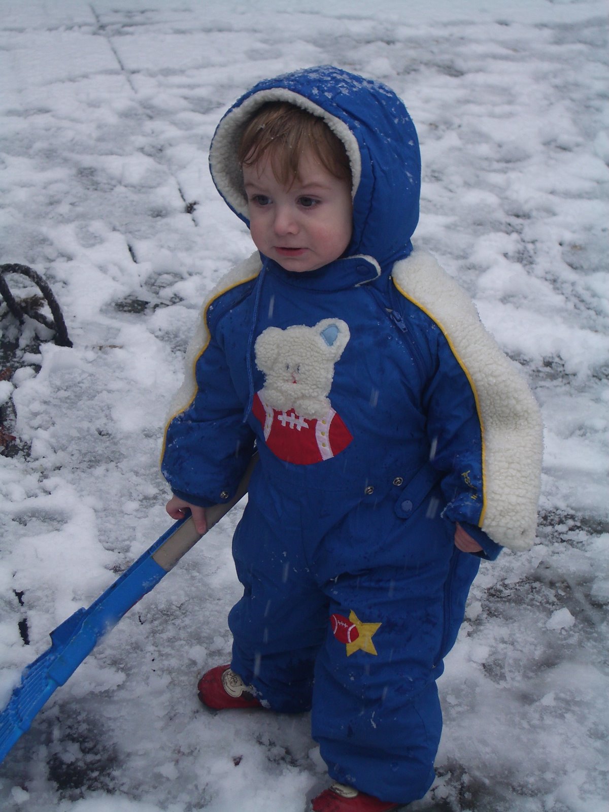 We got all suited up to go out and play in the snow, but alas, none of the kids were adequately outfitted. Chris had a warm coat, but only had tennis shoes. Kieran had hat, boots, and gloves, but refused to wear his warm jacket (typical of him; he insists that he doesn’t need a jacket most of the time we go out), and Nicholas had a wonderful snow suit, but no boots. He was in his soft-soled leather Robeez, not very good for wet snow! Alas, Mike was disappointed that none of them stayed out for more than 15 minutes, but I can’t say I blame them–it’s hard to enjoy the snow when you’re cold. Poor little Nicholas had it the worst; his feet were freezing when we brought him inside!!