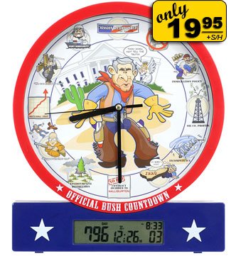 HOWEVER…I have a very, very hard time understanding how anyone in his or her right mind could have voted for George W. Bush not only once, but TWICE!!! W truly does make me embarassed to be an American. I’m counting the days until he is out of office. I just googled “Bush countdown new president” and found all sorts of products and websites tracking the number of months, days, and minutes until we have a new president. Have we as a country ever had a president who caused so many people to count the days until he’s out?