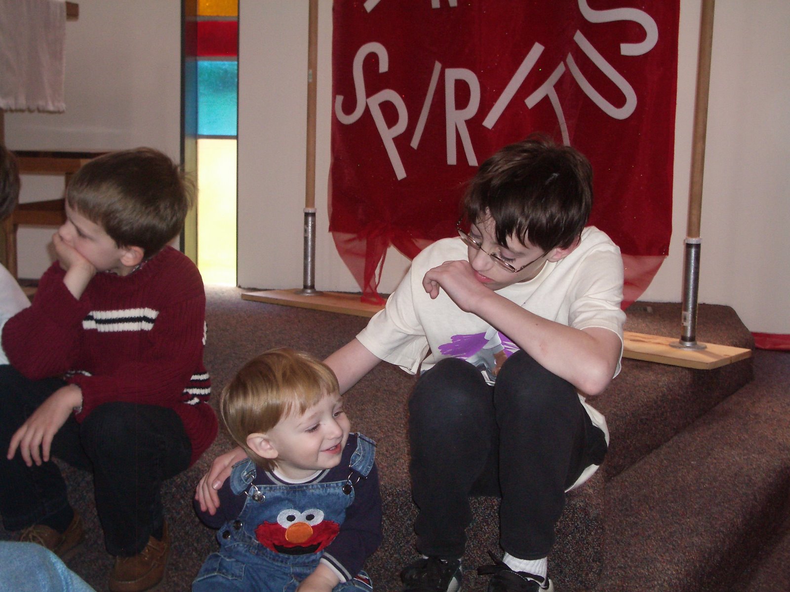 Recently in church, Nicholas has been going up to the Children’s Homily with Chris, and they are just so cute together! Chris was doing a valiant job trying to keep Nicholas from scrambling up behind the altar. When my boys are loving to each other, it makes my heart sing. I hope that they will become ever closer through the years, like I feel close to my sister.