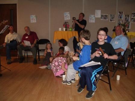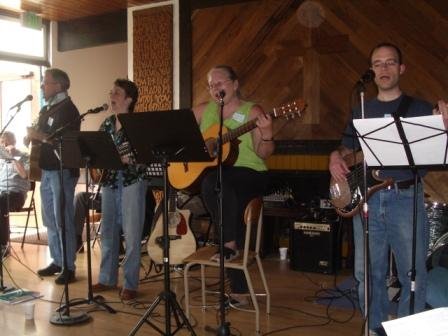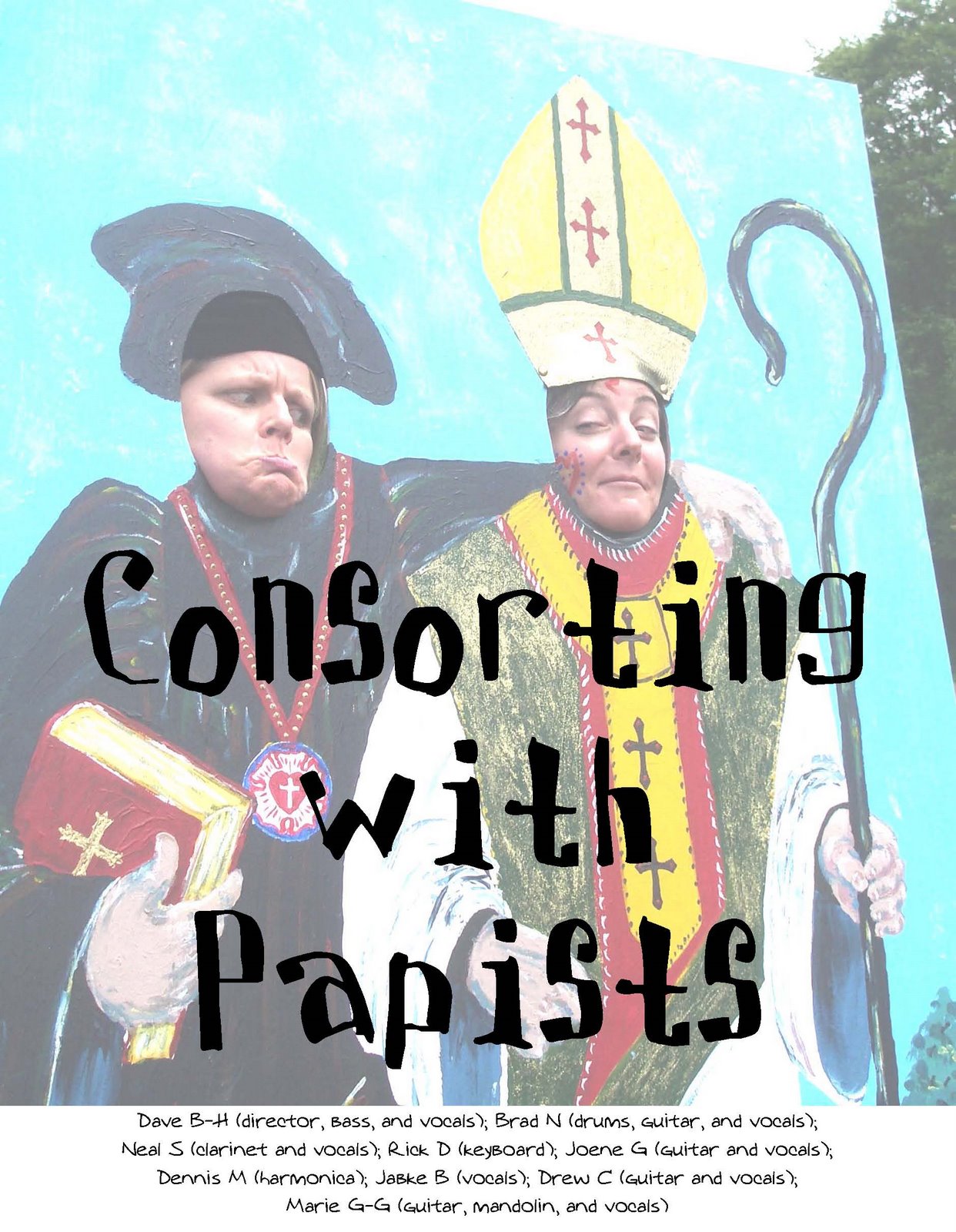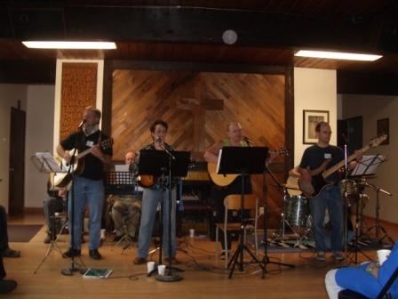 Consorting with Papists first formed a number of years ago to play at another community celebration, and its resurrection resulted in a much larger group of musicians. (The title comes from a critical comment written by a conservative writer about our hip young Lutheran pastor right after she joined the community.) We practiced for several weeks in a row (to the point where our spouses were looking forward to the end…) and prepared 10 to 12 songs for both gatherings. Our fearless band leader Dave wrote a wonderful song called “Confessions” (of a Lutheran’s Priest), and we also performed a great heretical version of the Lord’s Prayer called “Our Father” (by Susan Werner) and a song by Judy Fjell called “Where Are You Standing.” The arrangements of the usual folk song standards were fresh and unexpected (like the reggae “If I Had a Hammer”), thanks to our bandleader Dave and creative drummer Brad. We had talented improvisational solos from our clarinetist and keyboard player. Our version of “Wade in the Water” featured our pastor’s husband, Drew, channeling Mavis Staples in a deep, soulsy style that had his daughter rolling in her chair in laughter. It was great fun–we captured some of it on video, but I haven’t figured out how to edit my digital video yet!