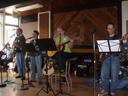 Here are some not-very-good shots of (part of) the band in our second performance: