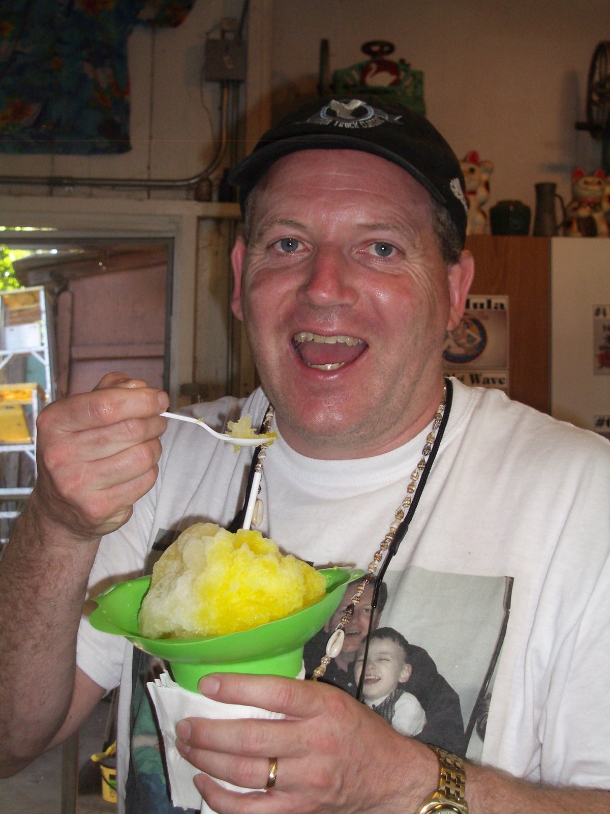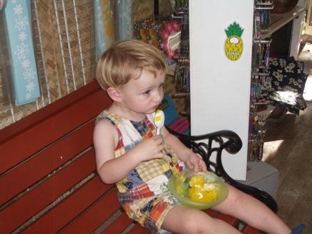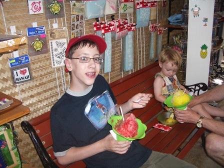 According to Aoki’s web site, “shave ice” was first introduced to the islands during the plantation days when hot, exhausted workers needed a way to cool off. They would shave a block of ice with a hand plainer and flavor it with juice. It’s essentially like a much more flavorful version of a sno cone. Aoki’s shave ice is the best because you can have ice cream at the bottom. Yum! My personal favorite flavor combination was the Local Mix: mango, pineapple, and li hing mui (Hawaiian sweet-salty plum). During the week we were in Haleiwa, we had shave ice a record three times!