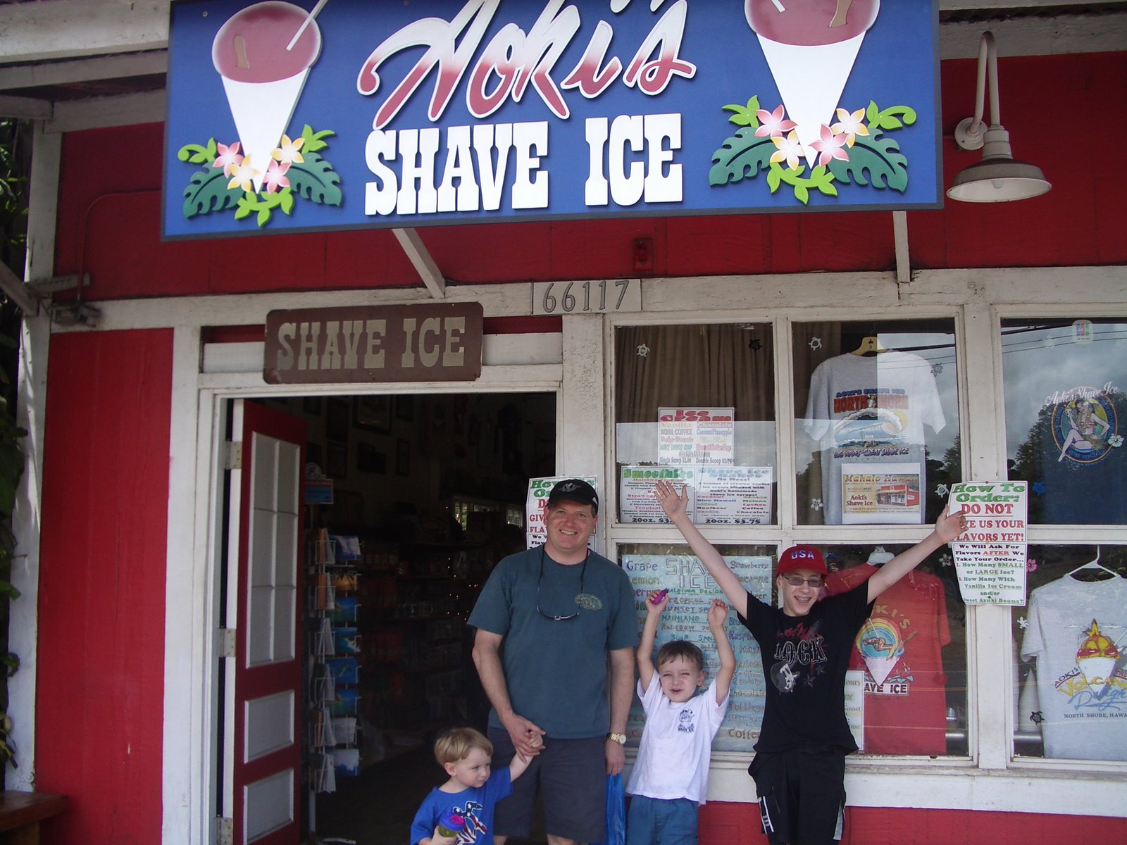 We (sadly) left the condo Friday morning after doing everything we could to clean up the messes left behind by a family with three boys, said our goodbyes, and went into Haleiwa for one last shave ice! Here the family stands getting ready for one last treat!