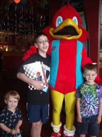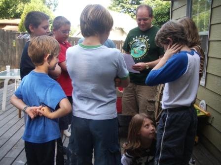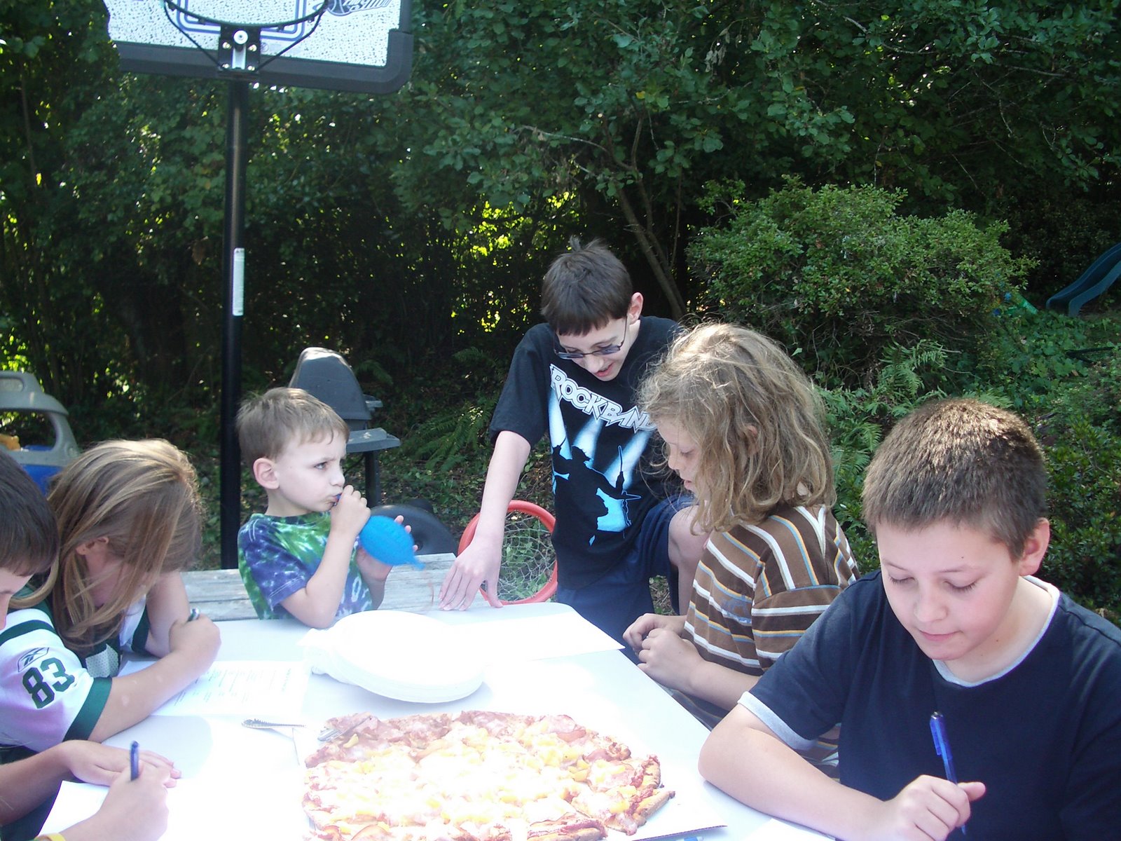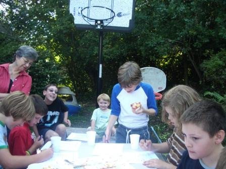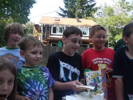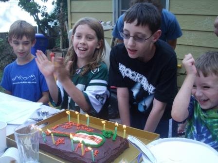 A few days after we returned from Hawaii in August (on Chris’ actual birthday), we celebrated his 12th birthday with an all-boy, “get in the game” party. We organized some outdoor games, including a “How Well Do You Know Chris?” quiz, and some of the kids also played “Rock Band” and “Mario Kart Wii” downstairs in the family room. It was a nice group of boys and a pretty easy party all in all. Thank goodness for a nice day–that’s one nice thing about having an August birthday, even though he was SUPPOSED to be born in December!