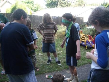 The airplane obstacle course (one player is the airplane in a blindfold, and his partner, the air traffic controller, has to navigate him on the runway so he doesn’t step on any of the obstacles)–this was a popular game!)