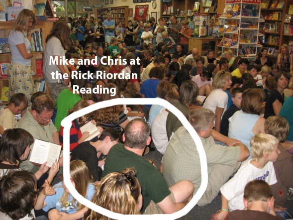 Chris and Mike have discovered a young adult book author called Rick Riordan. He writes fantasies based on Greek mythology. As Mike was a big Greek mythology fan as a kid, it’s the perfect combination. He recently surprised Chris by getting tickets to a book reading in Portland by Riordan. (He had to go to the bookstore a few days before to get them.) Riordan has become quite the craze among the grade school and middle school set, so the reading was very popular! Chris was ecstatic when Mike told him about it.