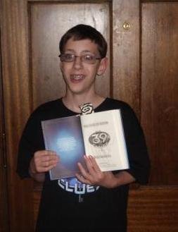 Here’s a photo of dinner the night before, when Mike presented Chris with Riordan’s new book (39 Clues) and told him about the book reading: