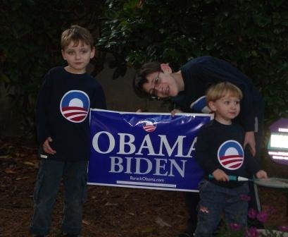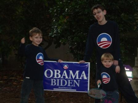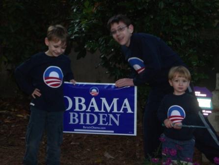 Chris, Kieran, and Nicholas were all extremely excited to get their one-of-a-kind, hand-appliqued Obama t-shirts! Last night I had Nicholas saying “YAY, OBAMA!” during the debate. Aren’t they cute?