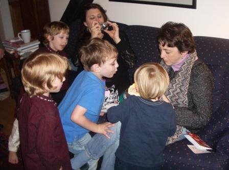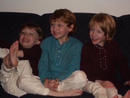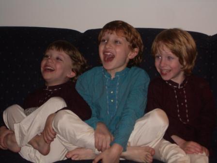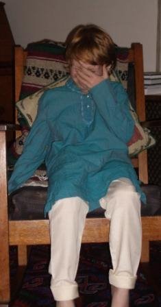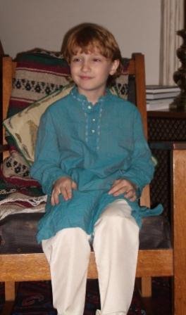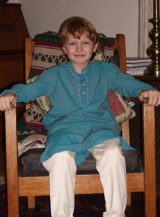 Later Nadine, who is an obsessive photographer, put the boys into adorable Indian suits that one of Nadine’s Indian patients gave them. She tried valiantly to take a photo of Ryan; however, her camera has a red-eye reduction feature, which means that it flashes twice. Each time her camera would flash, Ryan would squint or cover his eyes. This caused me to dissolve into fits of laughter. I thought the whole thing was SO funny!!! Small thrills for small minds, I suppose…