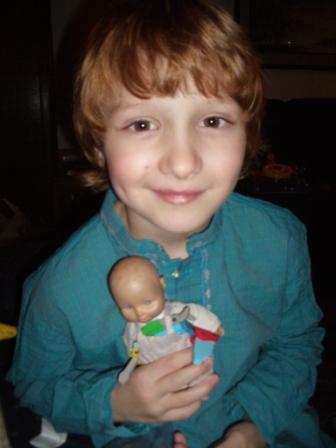 I just had to take a photo of his baby–take a look at the screwdriver in one hand and the saw in the other! And the overalls. Love it!