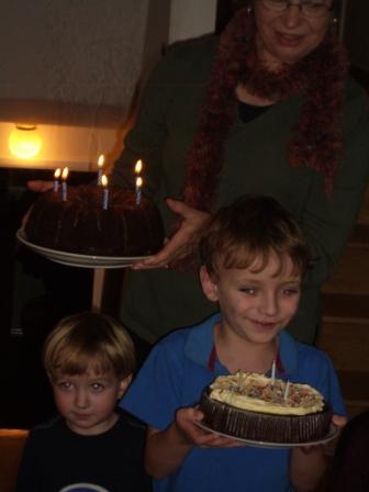 We had TWO cakes–one, the perennial family favorite, my mom’s Tunnel of Fudge, and the other cake contributed by Kieran, who won big in the cake walk at the school carnival the night before. He was very proud of his cake!!