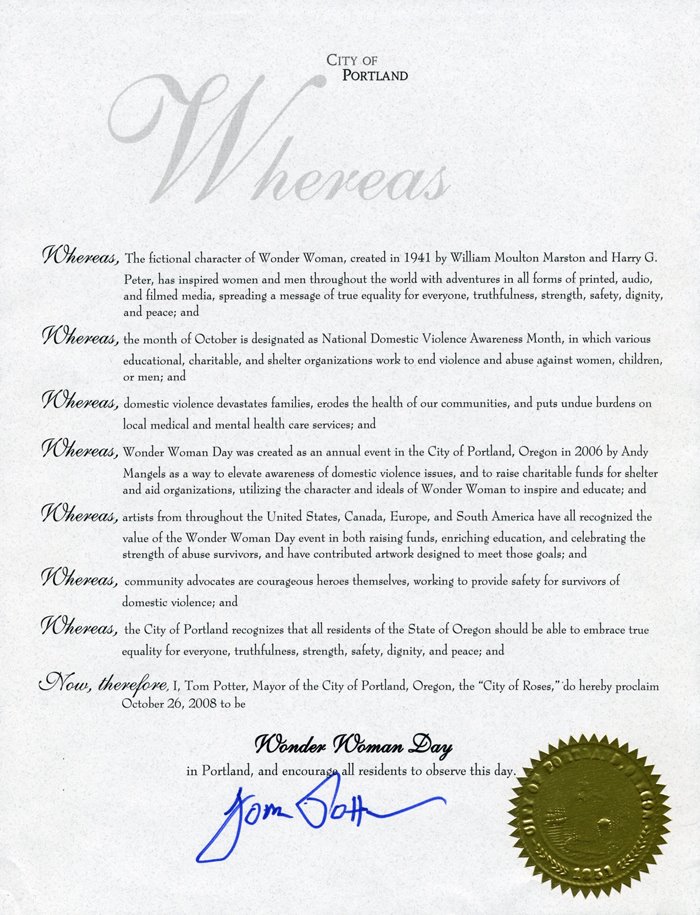 Sunday, October 26, 2008, has been declared (by mayoral proclamation, no less) to be Wonder Woman Day in Portland.