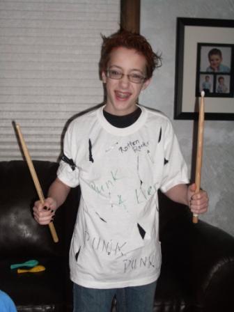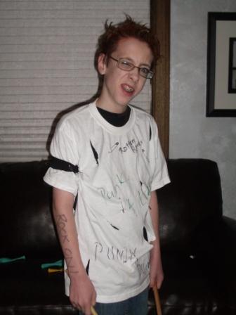 As a sign of Chris’ advancing years, he was not too focused on Halloween this year. I couldn’t get him to come up with any ideas for a costume, although he did want to dress up. So we basically came up with one for him…as a punk rocker. Mike bought some black fingernail polish and orange hair gel, and I cut up an old t-shirt and Mike wrote punk rock phrases all over it. Here he is: