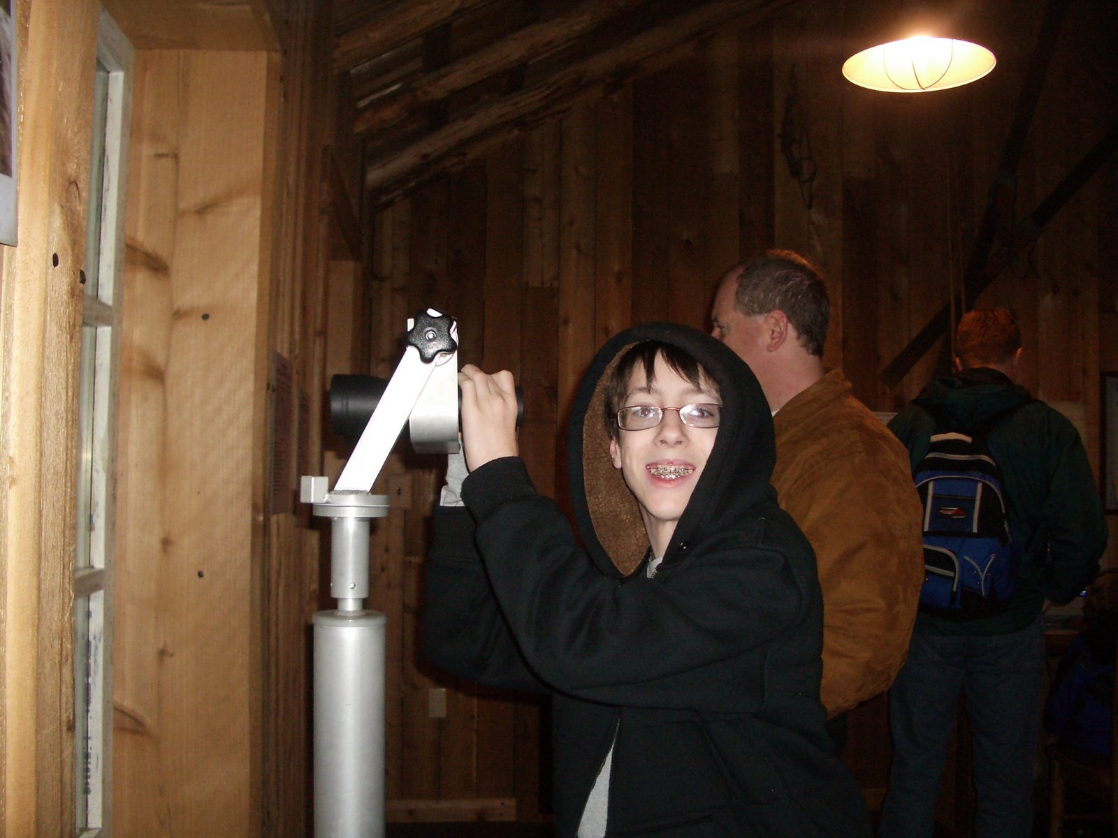 Chris looking at the wolves through the binoculars