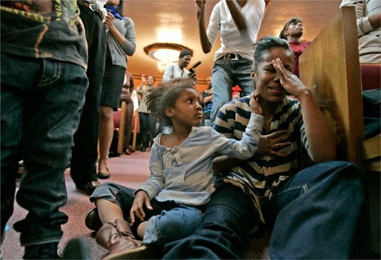 Latrice Barnes, right, is comforted by her daughter Jasmine Redd, 5. (David Goldman for The New York Times)