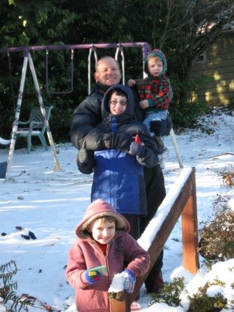 Mike’s mum arrived from the UK on Monday night, and my dad took Mike to the airport to retrieve her in his snow-tired car. The kids have had an early winter break, much to Chris’ delight and Kieran’s chagrin. He was looking forward to a holiday party today and his first-ever elementary school holiday concert tomorrow. This morning when he learned that he would not have school but Chris would be going in 2 hours late, there were tears and cries of how unfair it was that he couldn’t go although he wanted to, and Chris got to go but didn’t want to! About an hour later, though, the Portland Public Schools decided to close schools all day because of the expected storm this afternoon.