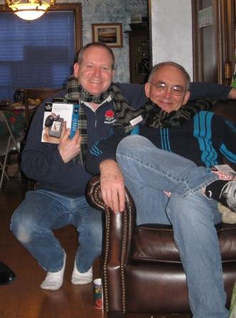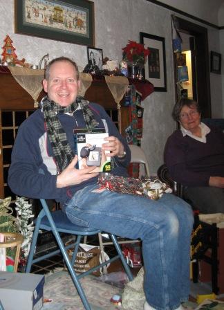 Mike posing with two of his gifts–a scarf and a digital photo frame key chain