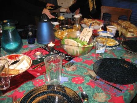 I received some fun and practical gifts: the most comfortable winter PJs EVER from Nadine and David and family–I never want to wear anything else!; a deliciously comfy winter robe, a guitar chord bible, tea, chocolate, and a diffuser from Mom and Dad; a book, One Year to an Organized Life, from Mike (which I had requested)–in addition to the new TV we bought for the whole family; and a beautiful handmade batik tablecloth and set of napkins, a wonderful dry measuring cup, and other stuff from Olga.