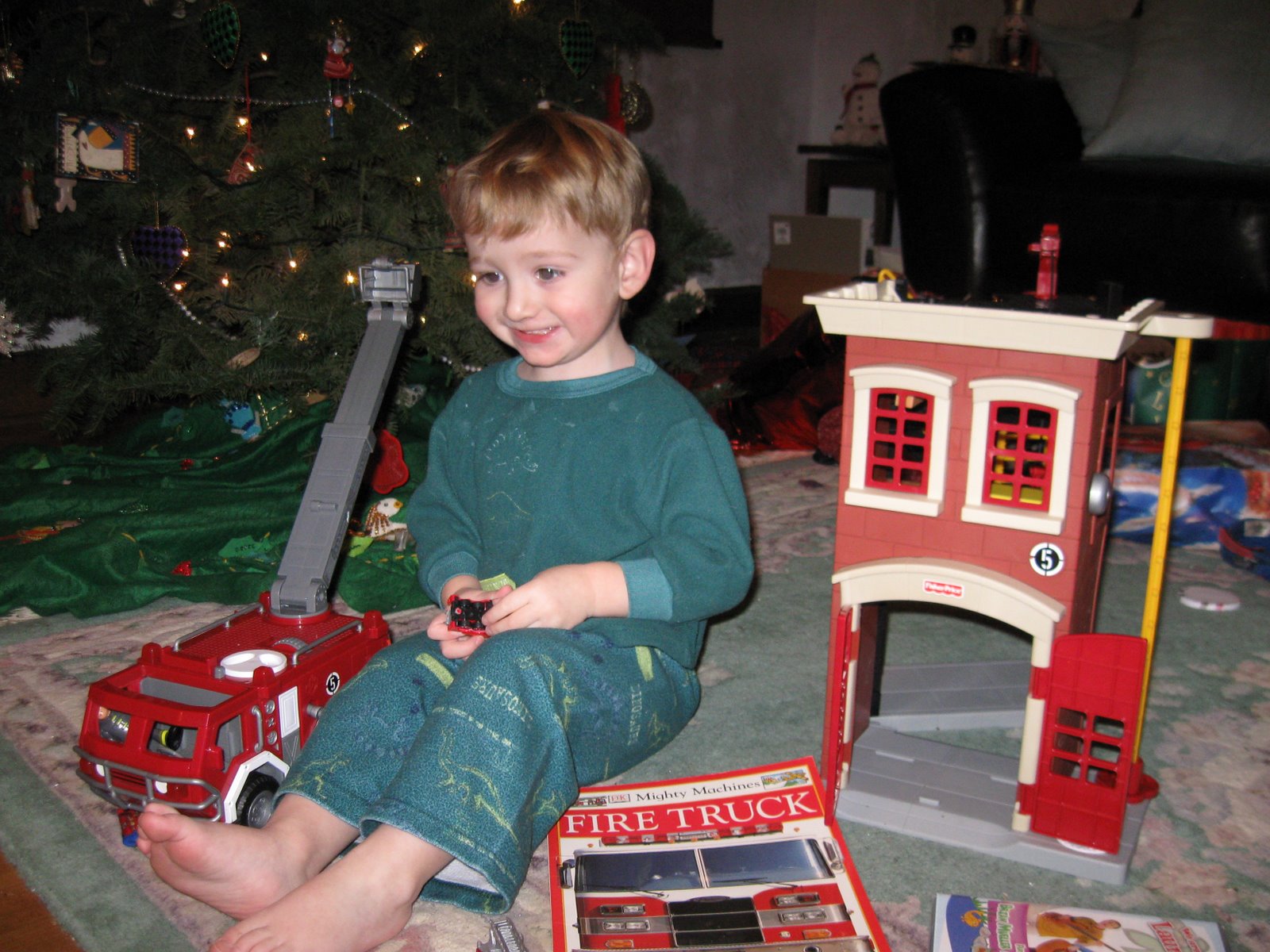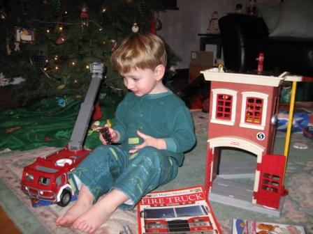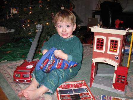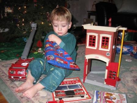 I had never noticed how many fire truck themed clothes, toys, and accessories there are available for little boys. (Yes, little boys…since all that sort of thing tends to be sadly very gender specific.) So this year was a three-alarm fire truck Christmas!