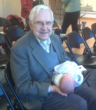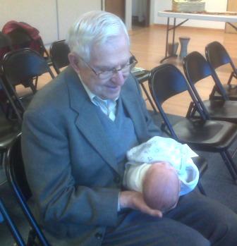 Sunday, in church, I couldn’t resist taking a few photos on my BlackBerry of this wonderful sight, of our friend Oscar, in his late 80s, holding baby Michael (a baby of a family who takes in special needs foster babies). Oscar and his wife Mary have known me since I was about 4 years old, and I love to see them when I go to church…reminds me of my history! One of my favorite memories of Holden Village two years ago was sitting on the porch swing with Mary and others, passing the time. They are both wonderful with children.