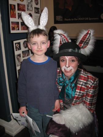 Kieran, who in the space of a couple of weeks has gone from wanting to produce “The Wizard of Oz” to “Bye Bye Birdie,” to now, “Alice in Wonderland,” was determined to wear white rabbit ears to the show this evening. He found some from an old costume we had, but he also spied some new ones in the gift shop for $2.50. When we went to get autographs from the cast members after the show, every actor mentioned the rabbit ears.