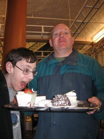 Mike had a lovely Greek salad; Chris had a grilled beef sandwhich and soup; Kieran had a breakfast scone (with eggs and bacon); Nick had a ham-and-cheese croissant; and I had the spanokopita (yummy!). Then came the best part: dessert!