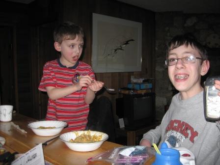 Not sure what choice tidbit Kieran is sharing with his older brother, but Chris is paying no attention!