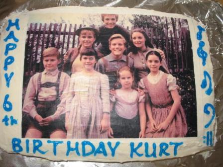 The birthday cake–I was hoping to use a much more colorful photo for the cake…but Kieran insisted on this one, because it shows Kurt and Friedrich in their lederhosen!! As I was decorating, Kieran kept bumping me, and I told him he’d better be careful or I would end up writing “Kurt” instead of “Kieran.” Of course, he was delighted with that idea…so there it is.