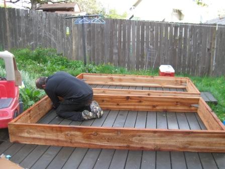 Mike went to the lumber yard and Lowe’s to buy materials, and spent hours outside on Saturday building the frames and preparing the garden plot. Next: to fill the plots with dirt and compost. And of course plants!