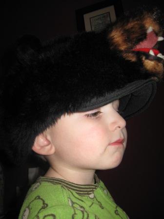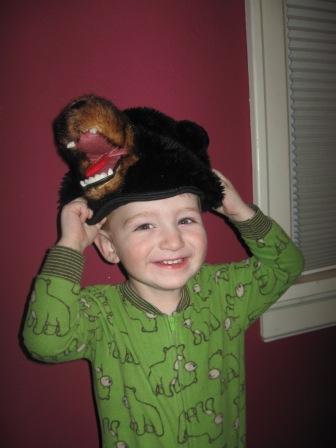 Here he is in his “bear phase,” wearing the bear hat I brought back one year from Alaska and watching wild bear videos on youtube: