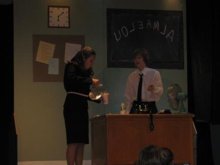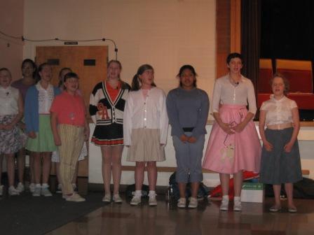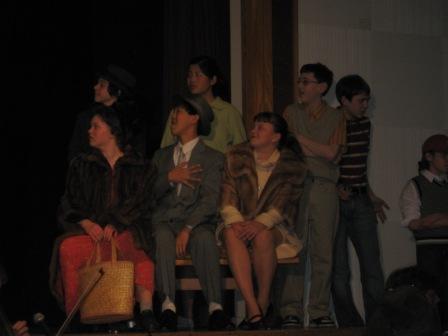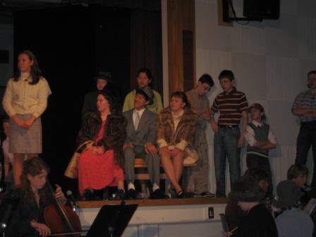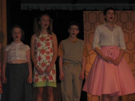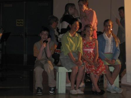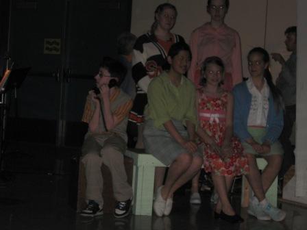 Some of the leads did an excellent job, while others were clearly nervous and less experienced on the stage. One of the most experienced actors on stage, an 8th grader, has 14 costume changes, and one of these changes caused her to miss one of her cues on stage. (She plays both Albert’s and Kim’s mothers.) Another minor lead actor missed several cues and a few lines as well.