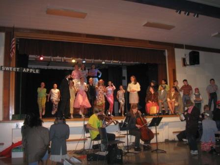 They have an orchestra, and they are a bit rusty. The music in “Bye Bye Birdie,” both the instrumentals and the vocals, is quite complicated. The trumpet player was struggling. And it was clear that the kids hadn’t practiced very extensively with the orchestra. Mike ran into a dad in the bathroom who was playing bass in the orchestra–apparently he hadn’t played for some time, and he told Mike that the music was hard…and they had to transpose some of it!