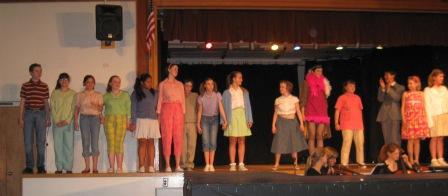Well, Mike’s writer friend was right…I guess that bad dress rehearsal = good performance! The kids did great at opening night last night–there were a few glitches, including the fact that somehow one whole song was missed! But the terribly rough transitions were smoothed over, and the play moved along at a clip. There were only a few missed lines, from what I could tell. Their performance was especially amazing given the fact that their director, Andrea, was called off to the set of the Harrison Ford movie, and was not able to be there for rehearsal yesterday (and also missed most of the play!). So they didn’t have their best coach there during rehearsal! Apparently they let her go at 6:30 tonight so at least she was able to see the play.