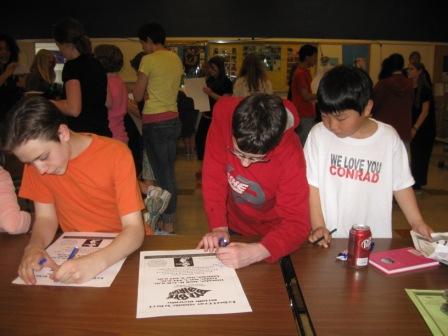 Signing posters at the cast party (Chris in the middle)