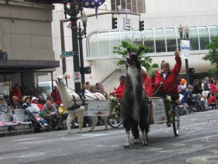 Sign of the times–usually they have an elaborate float for all the Rose Festival princesses and the queen, but this year it was a horse and buggy (and they were crammed into it)!