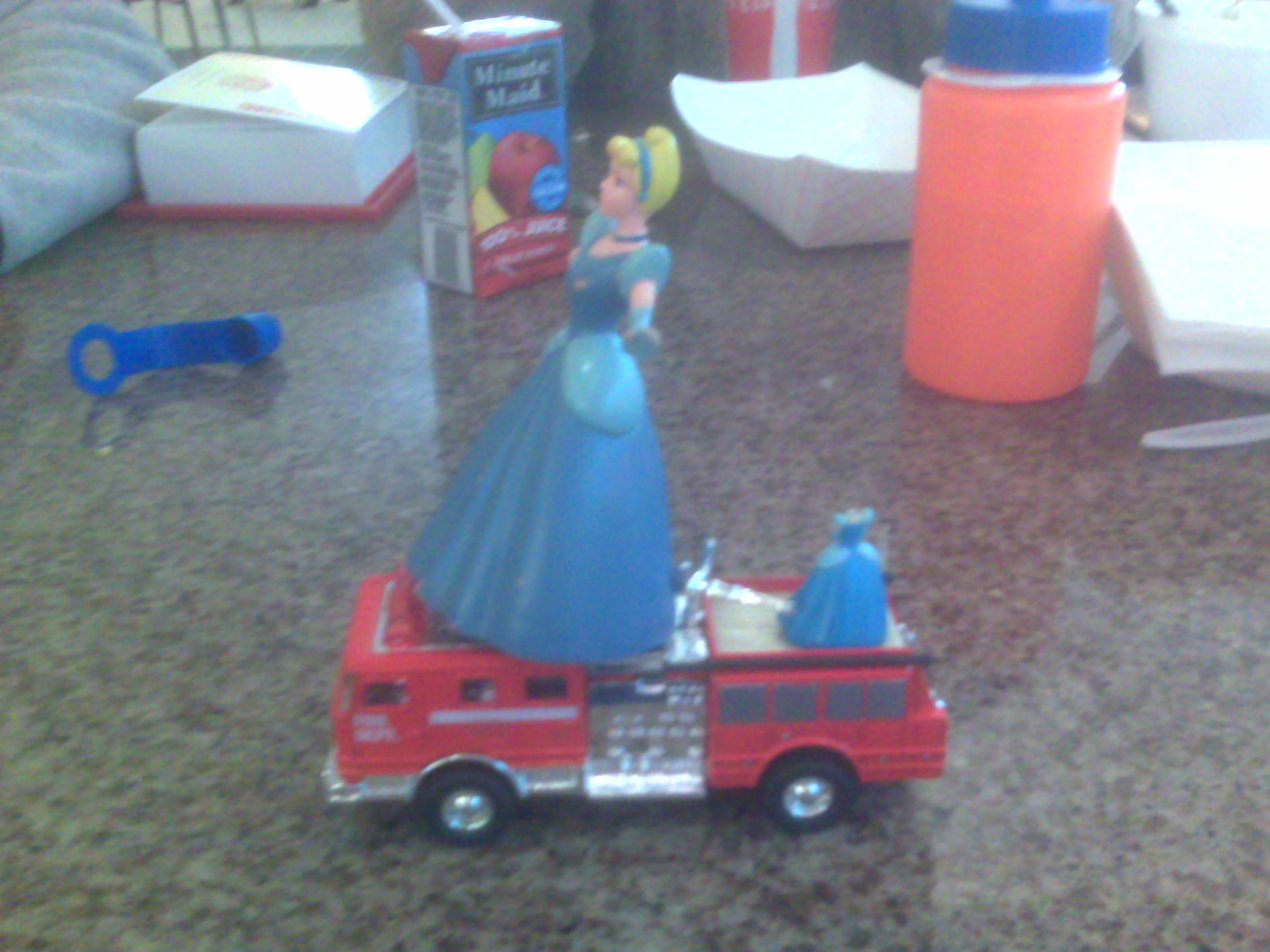 I do think, however, that it accurately depicts the renaissance men that we are raising. It was taken last winter in the food court at the mall. At the time, Nicholas was obsessed with fire trucks and Cinderella (a little less so now, although he still likes them both). For some reason, many of the plastic Disney figures we’ve bought or have been given have lost their limbs or appendages. This shows a headless mini-Cinderella (and a larger one) posing on a fire truck. Such is life in our household.