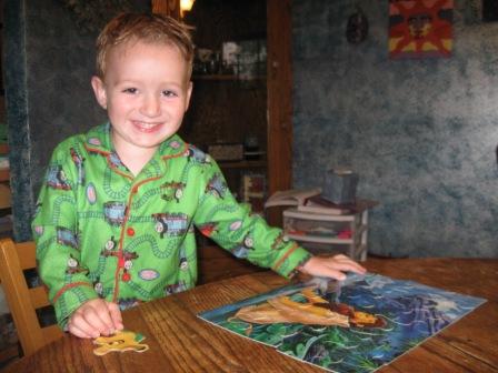 Here he is with his Lion King puzzle–he put it together all by himself! At the beginning, he shooed me away and announced he wanted to do it all by himself. During the process, half of the time he was singing (see video below) and the other half he was urging me to help him: “It’s harder!” And I kept encouraging him on to do it by himself.