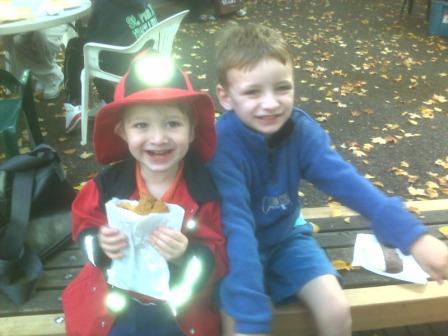 Kieran and Nick, who is modeling the cotton firefighter’s coat and hat I picked up at a resale shop–my deal of the week for $4.99–the kid can’t get enough of firefighter accessories and his previous firefighter coat is getting a bit small (and holding a pumpkin chocolate chip cookie):