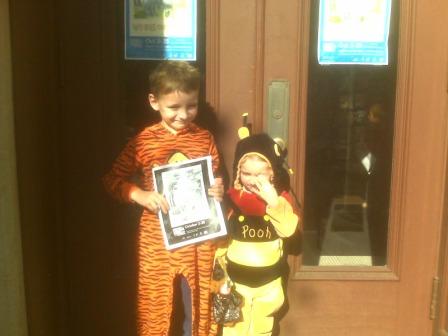 Nick wore the Pooh costume to church this morning, and this afternoon he wore the Tigger costume on a shopping expedition to Michael’s (for a school project for Chris).