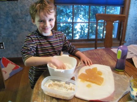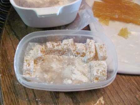 Kieran’s been desperate to make Turkish Delight, so we did just that a few days after Christmas. It’s a very time-intensive process. (If you have not recently read The Lion, the Witch, and the Wardrobe, the White Witch uses Turkish Delight to lure Edmond to come away with her.) It involves a lot of stirring, and we used my candle thermometer because we didn’t have a candy thermometer. Turkish Delight is like aplets and cotlets without the fruit and nuts. Yes, that’s right–pure sugar, with only rose water for flavoring. Mike grew up on the stuff–it’s popular in the UK–but his favorite kind was coated in chocolate!