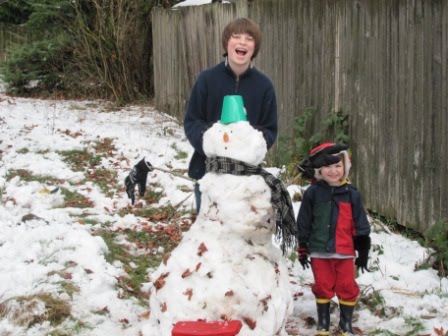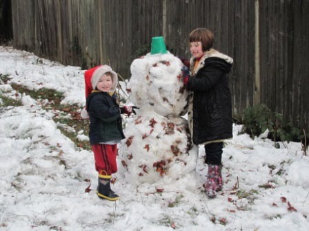 As you might remember, I’m a snow scrooge. I like it as long as I don’t have to go anywhere and it doesn’t last too long. By the next day, it was melting…but it stuck around long enough for the kids to build a snow person. The kids’ friends James and Leigh came over in the morning and helped them build a snow/leaf person (I understand that James did much of the work, actually!):