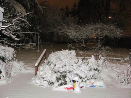 Mike decided to head off for home on foot (about 1.6 mile away) through the park, but the kids were extremely cold–they were not dressed for snow. They had coats, but no hats, gloves, or boots. Chris kept fretting about hypothermia. He went back to the center for awhile, and we kept consulting on the phone. I thought for sure it would stop soon and melt, and I was glued to the internet and our portable weather station to try to figure things out (alternating with being on the phone to my sister, debating our options–should we send David back out into the storm again to rescue them?). The meteorologists were no help at all…either saying that 1 inch had accumulated (actually, it was 3 inches) or saying that it would stop and warm up around 8:00 p.m. Well, it’s a good thing they didn’t wait for it to melt, because it didn’t stop snowing and start melting until overnight.