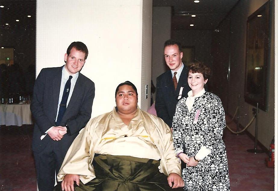 When we lived in Japan, I was an avid sumo fan. One of the “big” sumo wrestlers in the 1980s, Asashio, was an alum of the university where Mike taught (Kinki University–no joke!), and one evening we were invited to a large gathering honoring Asashio. Several other sumo wrestlers attended, including the heaviest sumo wrestler ever, Konishiki. Below is a photo of Mike, me, and our friend Tom, posing with the massive wrestler.
