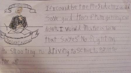 If I could be the president I would save good trees from getting cut down. I woiuld make a law that sayes “no fighting no shooting no driving to school to pollute the air.”