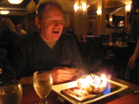 I had mentioned to the waitress that it was Mike’s birthday–you can always tell a good restaurant if you drop a birthday hint and they do something special. In this case, it was a flaming dessert–their s’more specialty–ice cream, marshmallows, chocolate sauce, and graham cracker crumbs on a puff pastry crust–all on a flaming piece of wood, so it smelled just like campfire s’more! Yum!